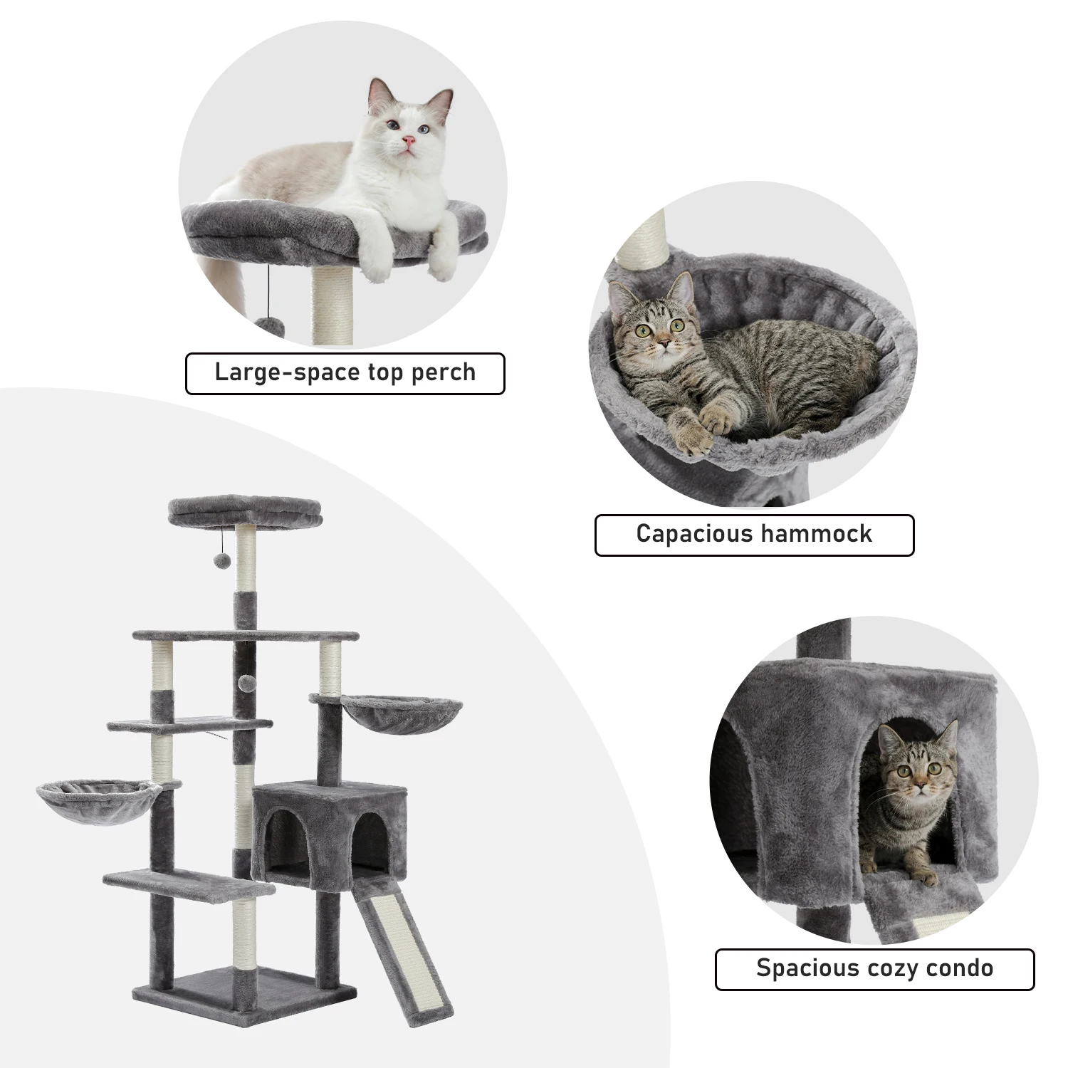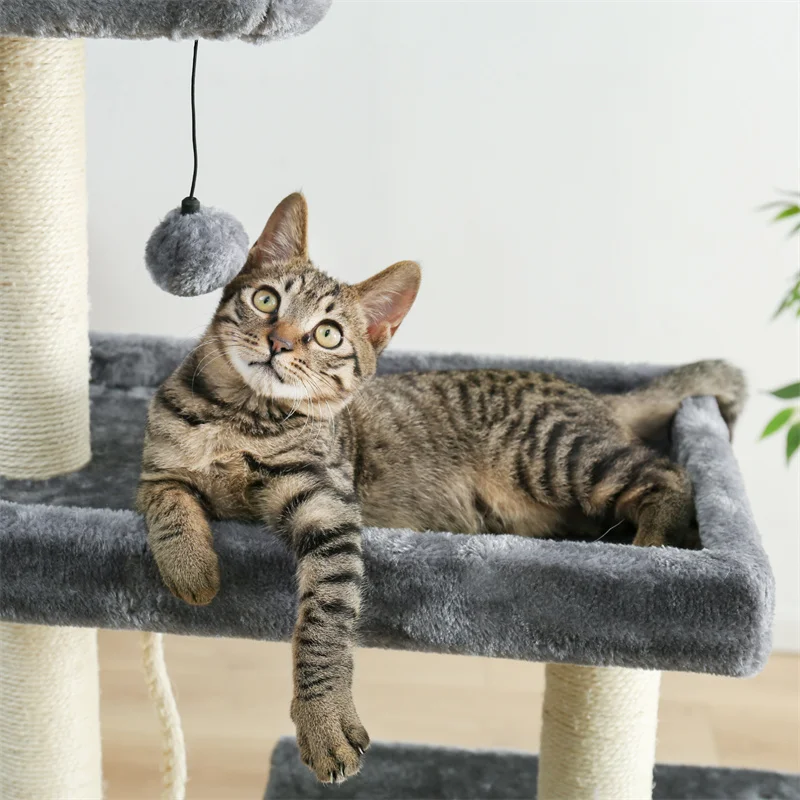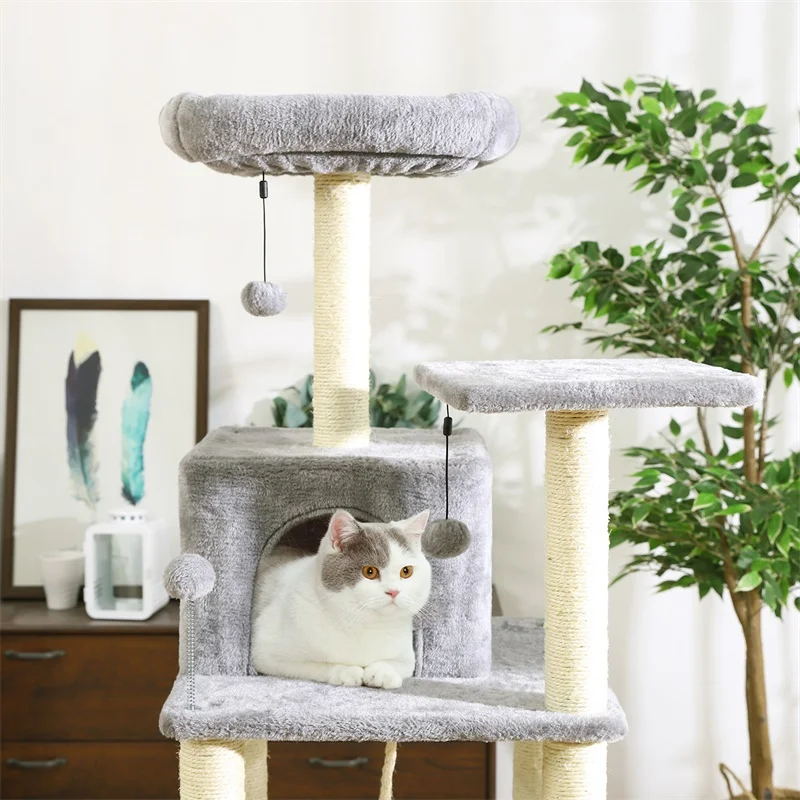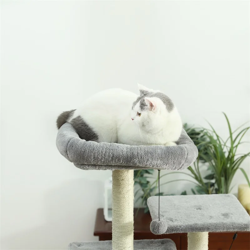 Invite your lovely kitties to this fluffy, loft-like cat tree. With the help of the “steps”, both kittens and old cats will feel at ease to go upstairs for some rest The top padded perch is a roomy suite, the lower part is their happy playground. After lunch, they can also bathe in the sunshine, take a nap in the basket lounger, or enjoy their “meow time” in the private cave of the cat tower it ha reinforced engineered wood base plate, this cat scratching tree is just about as sturdy as a tree. Energetic jumps from bulky or well-fed cats won’t be an issue.