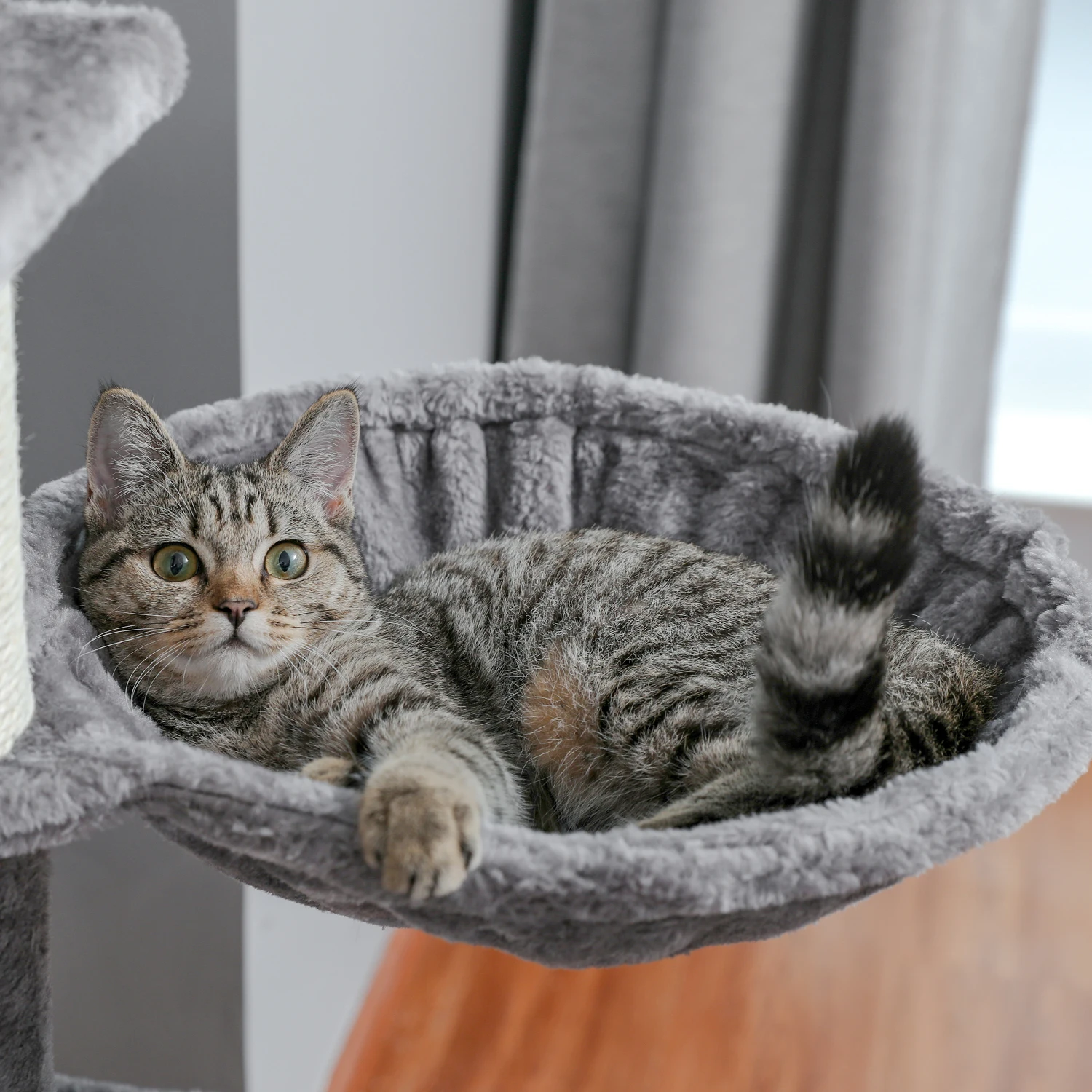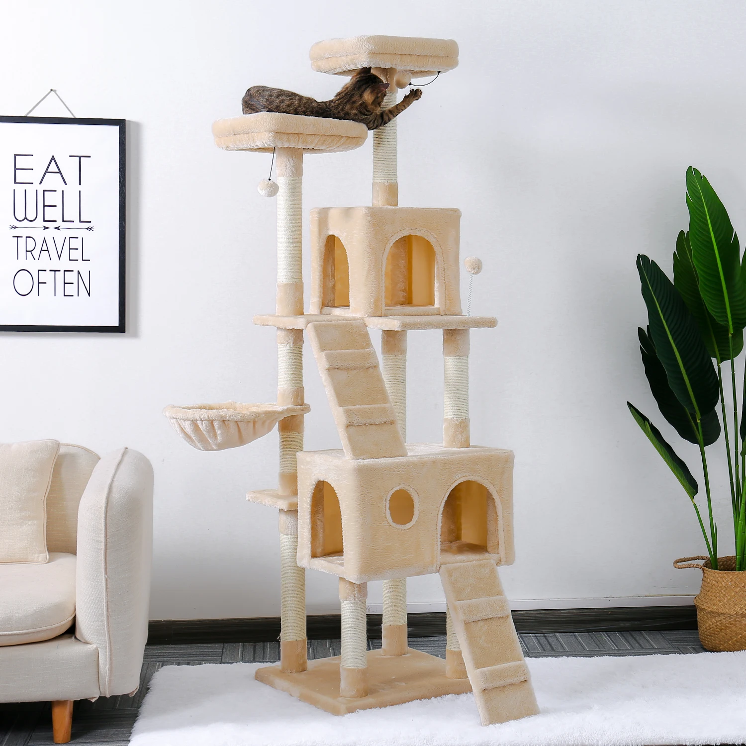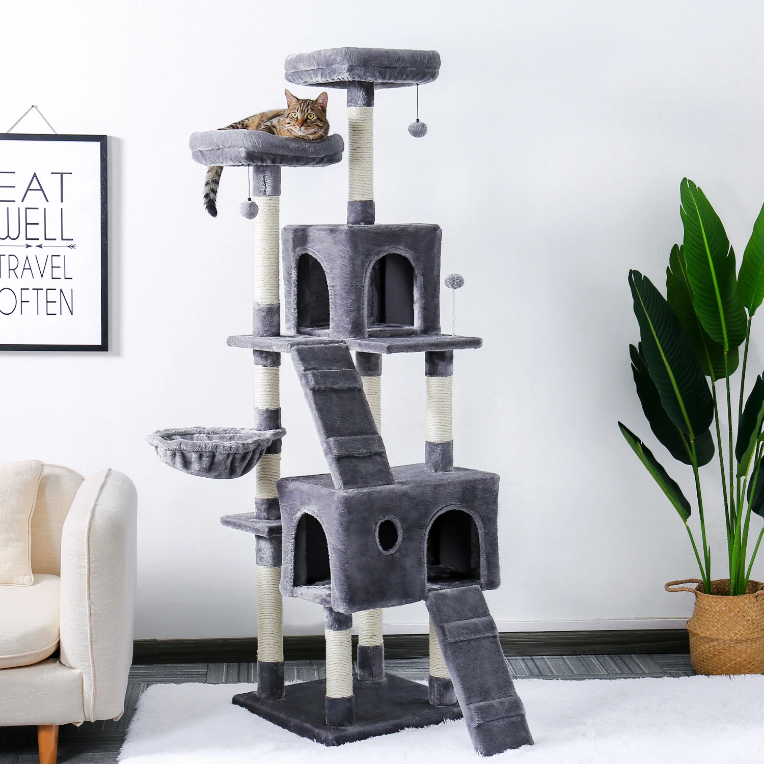 Invite your lovely kitties to this fluffy, loft-like cat tree. With the help of the “steps”, both kittens and old cats will feel at ease to go upstairs for some rest The top padded perch is a roomy suite, the lower part is their happy playground. After lunch, they can also bathe in the sunshine, take a nap in the basket lounger, or enjoy their “meow time” in the private cave of the cat tower it ha reinforced engineered wood base plate, this cat scratching tree is just about as sturdy as a tree. Energetic jumps from bulky or well-fed cats won’t be an issue.